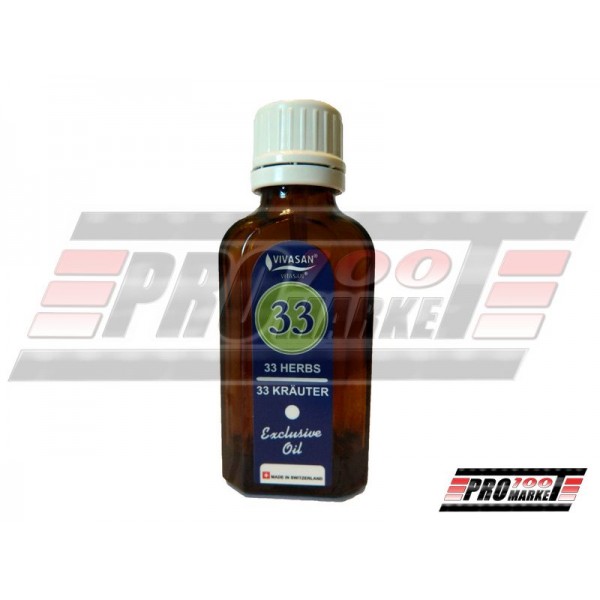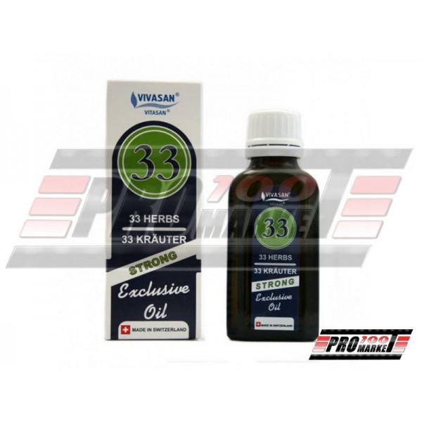 До складу олії 33 трави входить комплекс натуральних ефірних олій евкаліпта, кайепута, м'яти польової, апельсина, лимонної індійської трави, гвоздики, ялівцю, рожевого дерева, лимона, розмарину, лаванди вузьколистої, шавлії, чебрецю, коричника цейлонського, мірри гіркою абіссінської, базиліка, ладану, гаультерії лежачої, фенхелю, герані запашної, мандарина, лавра благородного, гірської сосни, фісташки мастикової, стираксовой смоли, естрагону (тархуну), кропу, селери, ванілі, ірису блідого, мироксилона бальзамоносного, ферули гальбаноносной, женьшеню.